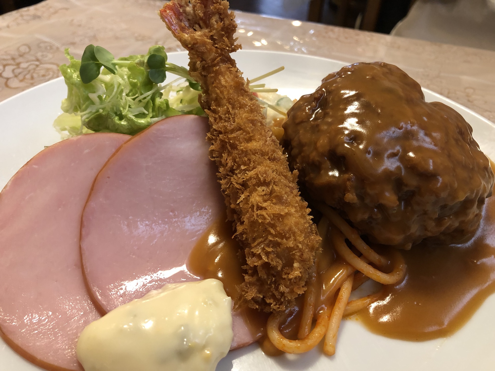 作業後、お昼ご飯で洋食屋さんに行きました。大好きなハンバーグ&エビフライ定食。贅沢ランチで、大満足でした!