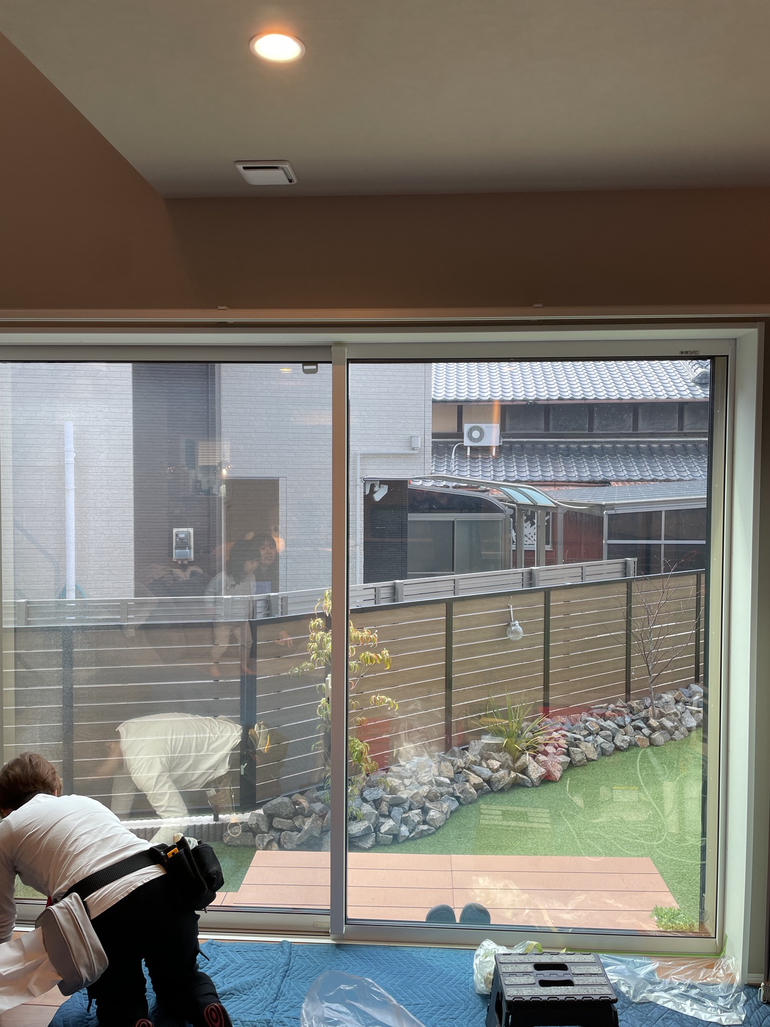大阪府寝屋川市の戸建てにて、目隠し対策としてゴールド系のミラーフィルムを施工しました。